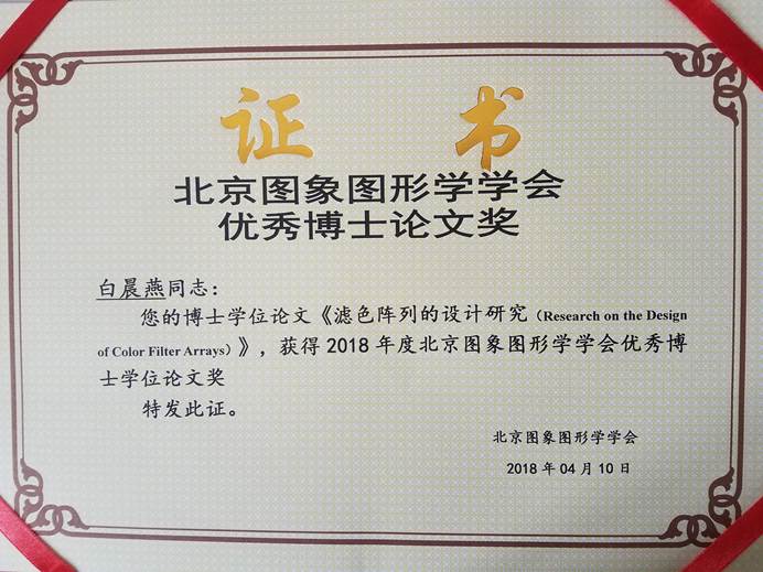 其中,彩票平台大全 于剑教授和林宙辰教授(北京大学)联合指导的博士研究生白晨燕,赵瑞珍教授、岑翼刚教授联合指导的博士研究生王恒友,二人的博士学位论文《滤色阵列的设计研究》和《面向图像恢复的低秩矩阵重构算法研究》分别荣获北京图象图形学学会2018优秀博士学位论文奖。