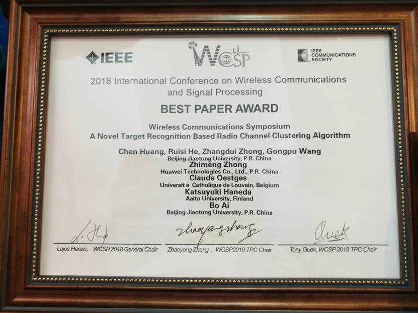 金秋是收获的季节,在这个季节彩票平台大全 博士研究生再传佳讯:2016级博士研究生黄晨获得第十届无线通信与信号处理国际学术会议(The Tenth International Conference on Wireless Communications and Signal Processing, IEEE WCSP 2018,//www.ic-wcsp.org/)最佳论文奖。