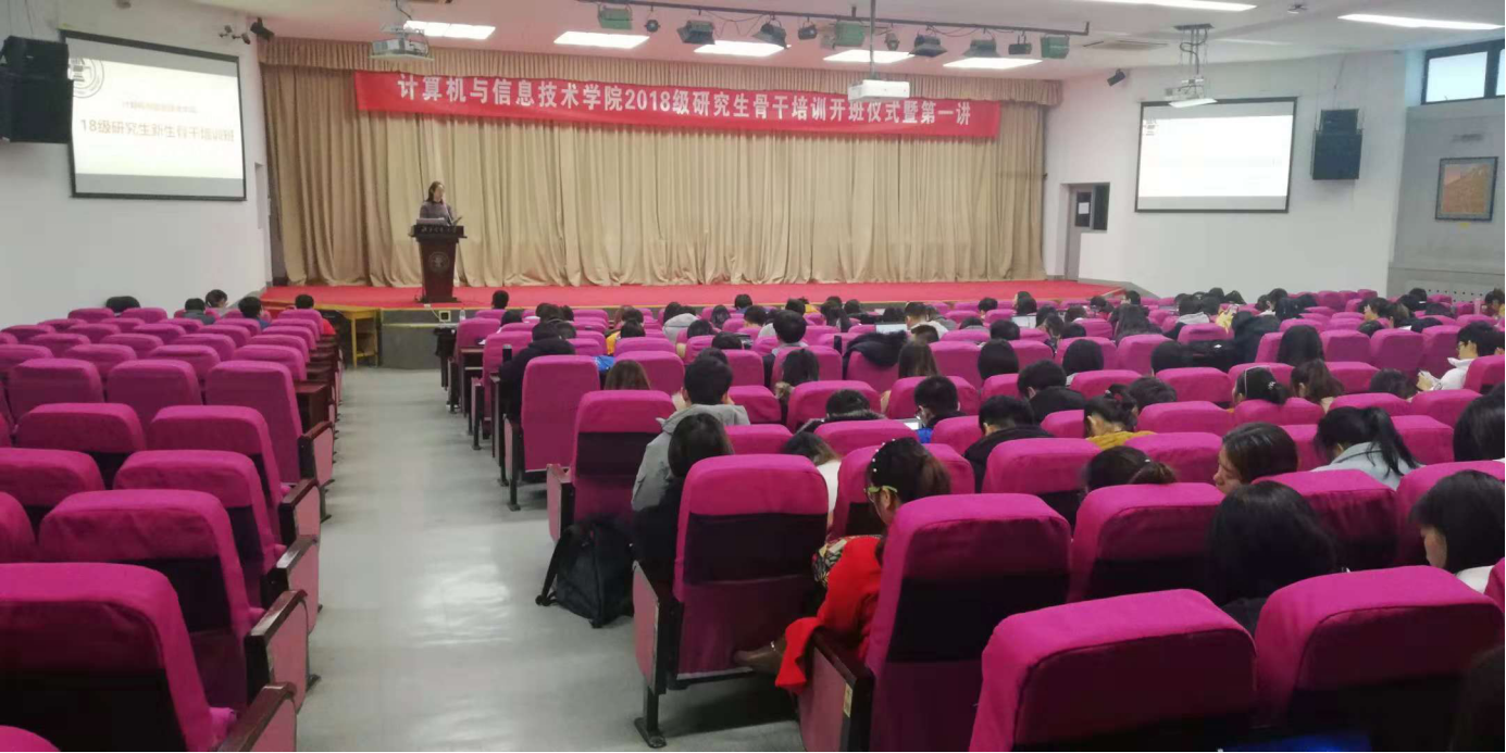 2018年11月30日,计算机与信息技术学院2018级研究生骨干培训班开班仪式暨第一讲在中心报告厅召开。彩票平台大全 党委书记杨晓晖、校研究生工作部副部长郭祎华、兼职辅导员董瑞、研究生各年级兼职辅导员以及2018级研究生骨干和党员同学们参加了会议。