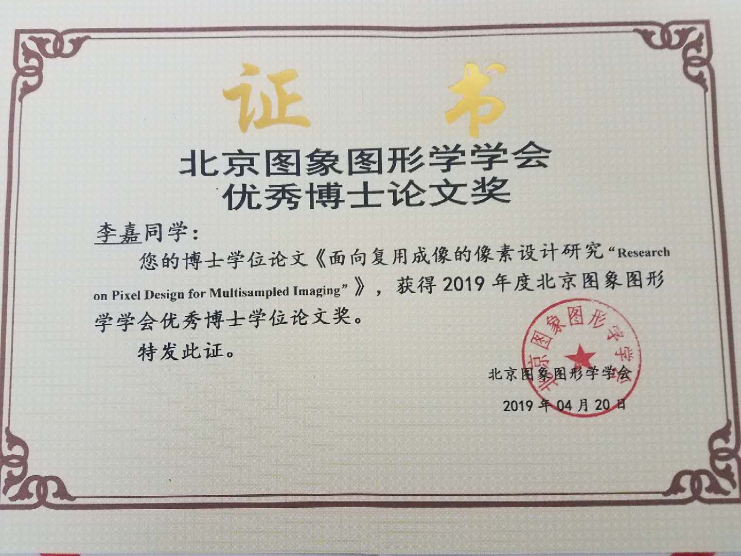 彩票平台大全 李嘉博士荣获北京图象图形学学会