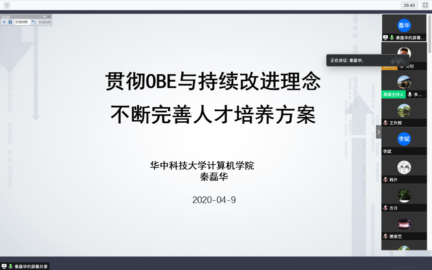 2020年4月9日,在疫情防控取得阶段性胜利,武汉顺利解禁之际,彩票平台大全 邀请了华中科技大学彩票平台大全 副院长秦磊华教授做了主题为“贯彻OBE与持续改进理念,不断完善人才培养方案”的在线报告,主要探讨了人才培养方案修订中的相关问题。彩票平台大全 院长蔡伯根、副院长李清勇以及专业责任教授、教学主任、任课教师、教学管理人员共计50余人参加此次在线报告。