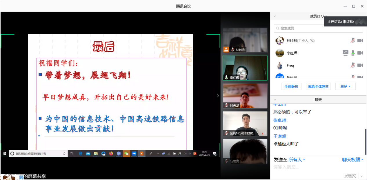 2020年6月29日下午四时,彩票平台大全 铁路信息技术班毕业生座谈会于线上召开。参会人员包括刘峰、李红辉等8名网管研究中心教师和2016级计算机科学与技术(铁路信息技术)专业全体毕业班同学。