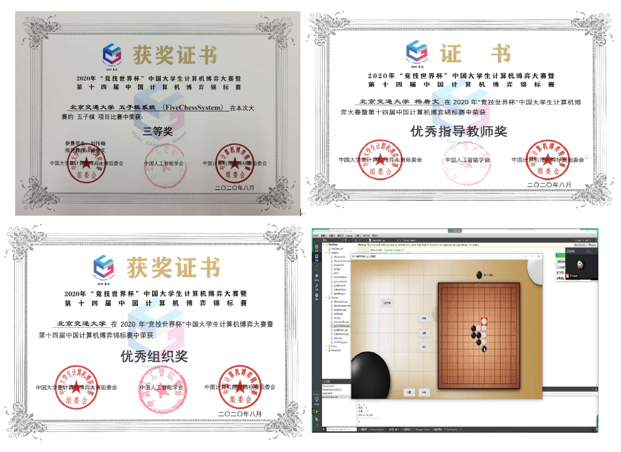 计算机与信息技术学院本科二年级本科生刘伟畅同学参加了五子棋赛,历经紧张比拼,最终荣获五子棋赛“三等奖”,指导教师杨唐文教授荣获“优秀指导教师奖”,北京交通大学荣获“优秀组织奖”。