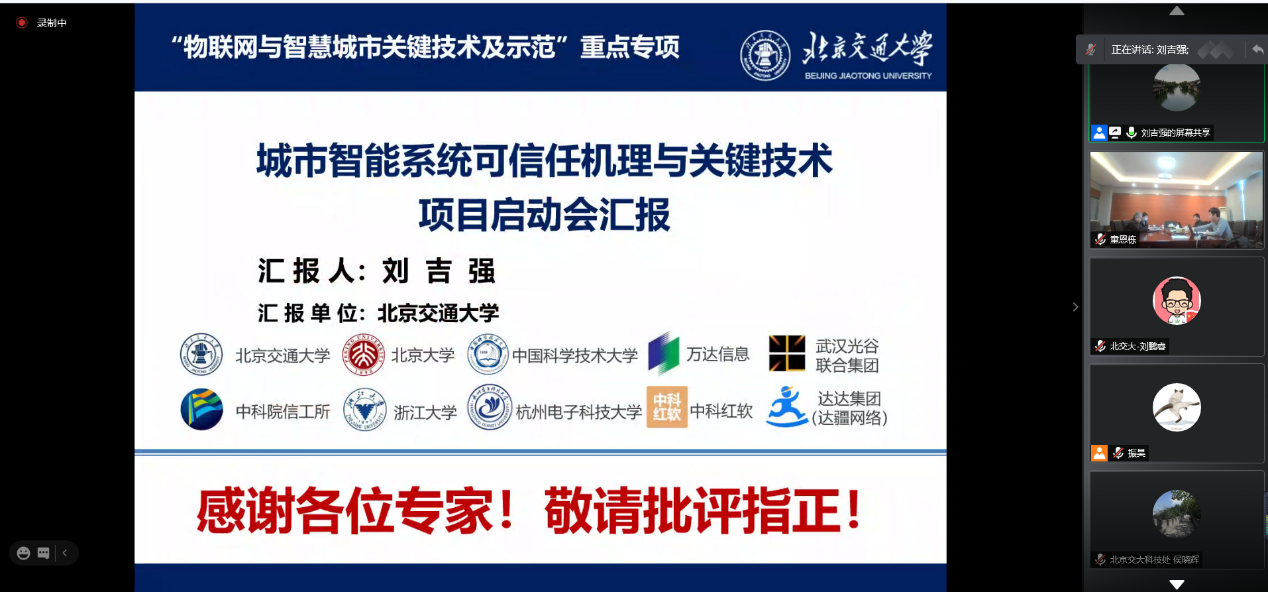 1月8日,由北京交通大学牵头,彩票平台大全 刘吉强教授承担的2020年国家重点研发计划“物联网与智慧城市关键技术及示范”重点专项项目“城市智能系统可信任机理与关键技术”项目启动会在线上成功召开。