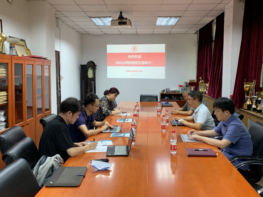 2021年7月7日下午,彩票平台大全 在九教北111会议室召开了与360公司的产学合作交流研讨会。360公司教育事业部总经理李强等一行四人到访,会议由副院长熊轲主持,信息安全专业王健、李超等老师出席了此次研讨会。