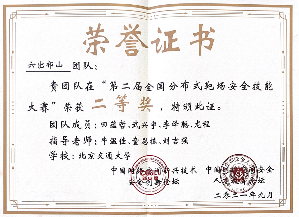 由鹏城国家实验室(副部级)、华中科技大学、武汉大学、四川大学、中电长城网际、中汽创智、宁波工业互联网研究院联合承办,方滨兴院士等专家参与指导的第二届基于全国分布式靶场的安全技能大赛于9月17日圆满落幕。北京交通大学网络空间安全学科责任教授刘吉强老师领队、牛温佳和童恩栋老师指导的“六出祁山”队经过8小时的鏖战再获佳绩,以3665分夺得第二届分布式靶场安全技能大赛第二名,获得二等奖。