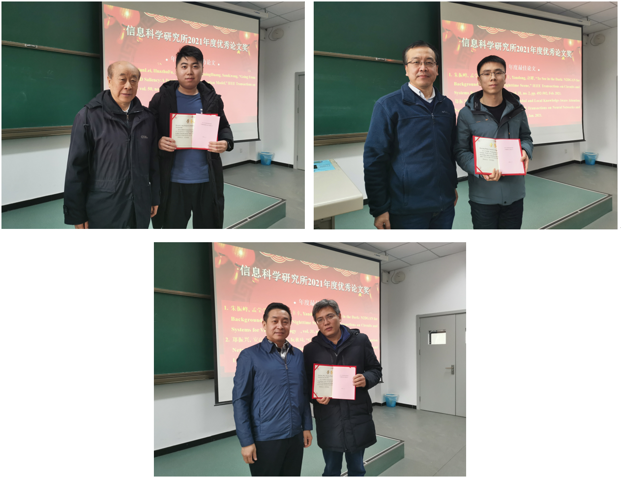 接着,副所长倪蓉蓉教授宣读了年度优秀论文评选及奖励细则。经过个人申报、资格审议和教师投票朱振峰教授发表的论文“To See in the Dark: N2DGAN for Background Modeling in Nighttime Scene”和博士生郑振兴(导师:安高云教授)发表的论文“Global and Local Knowledge-Aware Attention Network for Action Recognition”获得年度最佳论文奖,丛润民副教授发表的论文“Going From RGB to RGBD Saliency:A Depth-Guided Transformation Model”获得年度最具影响力论文奖。阮秋琦教授、贾卓生书记、蔡伯根院长分别为三篇论文的获奖作者颁奖。