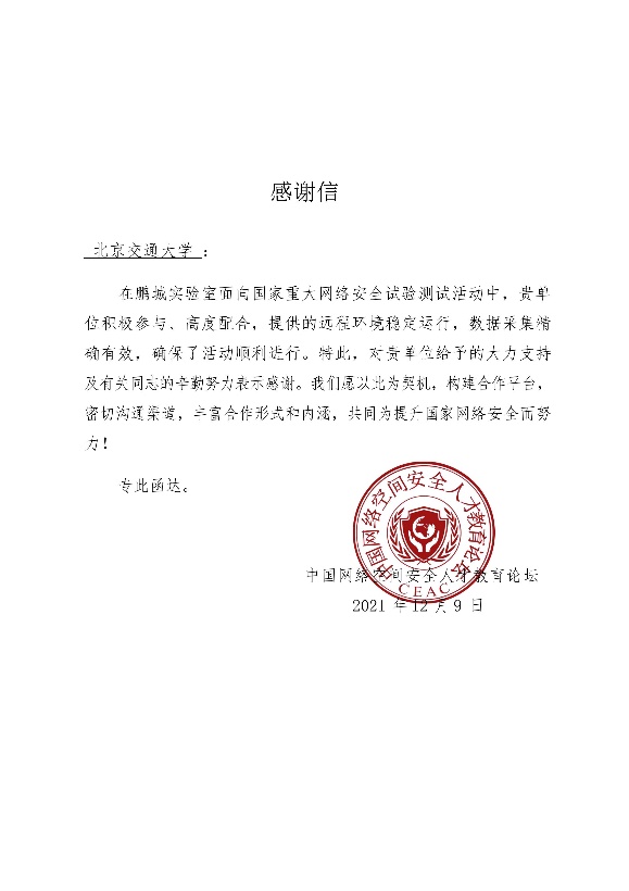在近期鹏城实验室面向国家重大网络安全试验测试活动中,北京交通大学网络空间安全学科责任教授刘吉强老师领队、童恩栋和牛温佳老师指导的研究生团队(吴亚伦、武兴宇、田蕴哲、相迎宵、孙瑞等)积极配合,保障了北京交通大学靶场节点的远程环境稳定运行、数据采集精确有效,获鹏城实验室、中国网络空间安全人才教育论坛(“网教盟”)、中国网络空间新兴技术安全创新论坛(“新安盟”)感谢信。