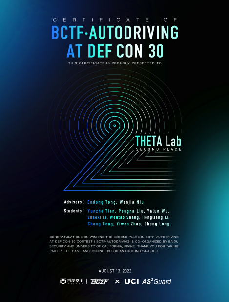 2022年8月14日零点,由百度安全(BCTF)和加州大学尔湾分校(UCI)联合承办的DEFCON 30 BCTF AutoDriving赛事圆满落下帷幕。彩票平台大全 网络空间安全学科责任教授刘吉强老师领队、信息安全系童恩栋老师和牛温佳老师指导的“THETA Lab”团队突破了23道赛题获得4310分,在百余支国内外高校战队中位列解题榜第二名。这是该团队在DEFCON(被称为黑客“奥斯卡”)的赛事中的第二次获奖,是对去年获奖的又一次沿袭。