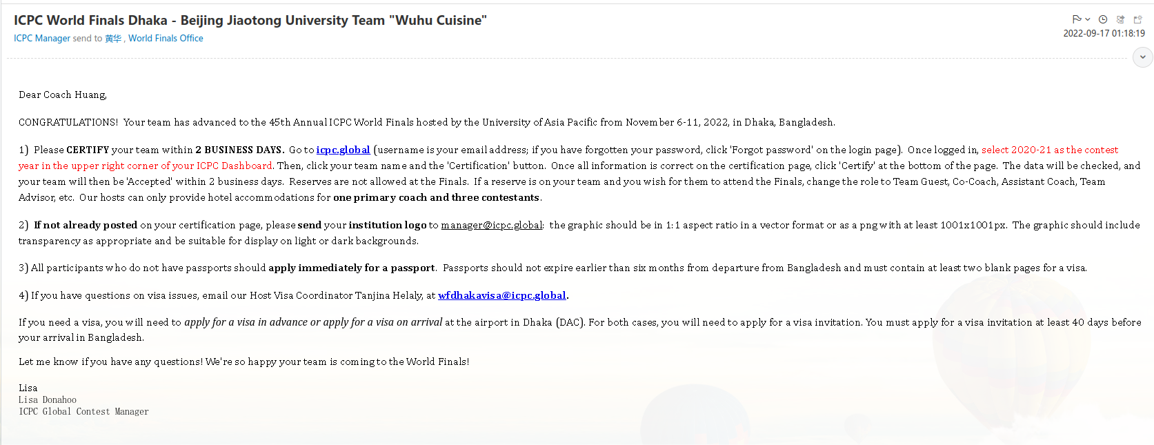 图2 ICPC总部通知彩票平台大全 晋级全球总决赛的邮件