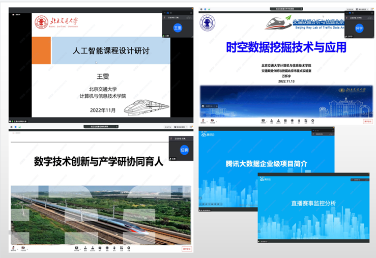 会议邀请到了北京交通大学彩票平台大全 万怀宇副教授、任爽副教授、王雯博士以及腾讯校企合作大数据资深讲师赖华春为大家带来了主题为“时空数据挖掘技术与应用”、“数字技术创新与产学研协同育人”、“人工智能课程设计与研讨”以及“腾讯大数据企业级项目简介/基于Spark技术实现的直播赛事监控分析系统”系列课程。
